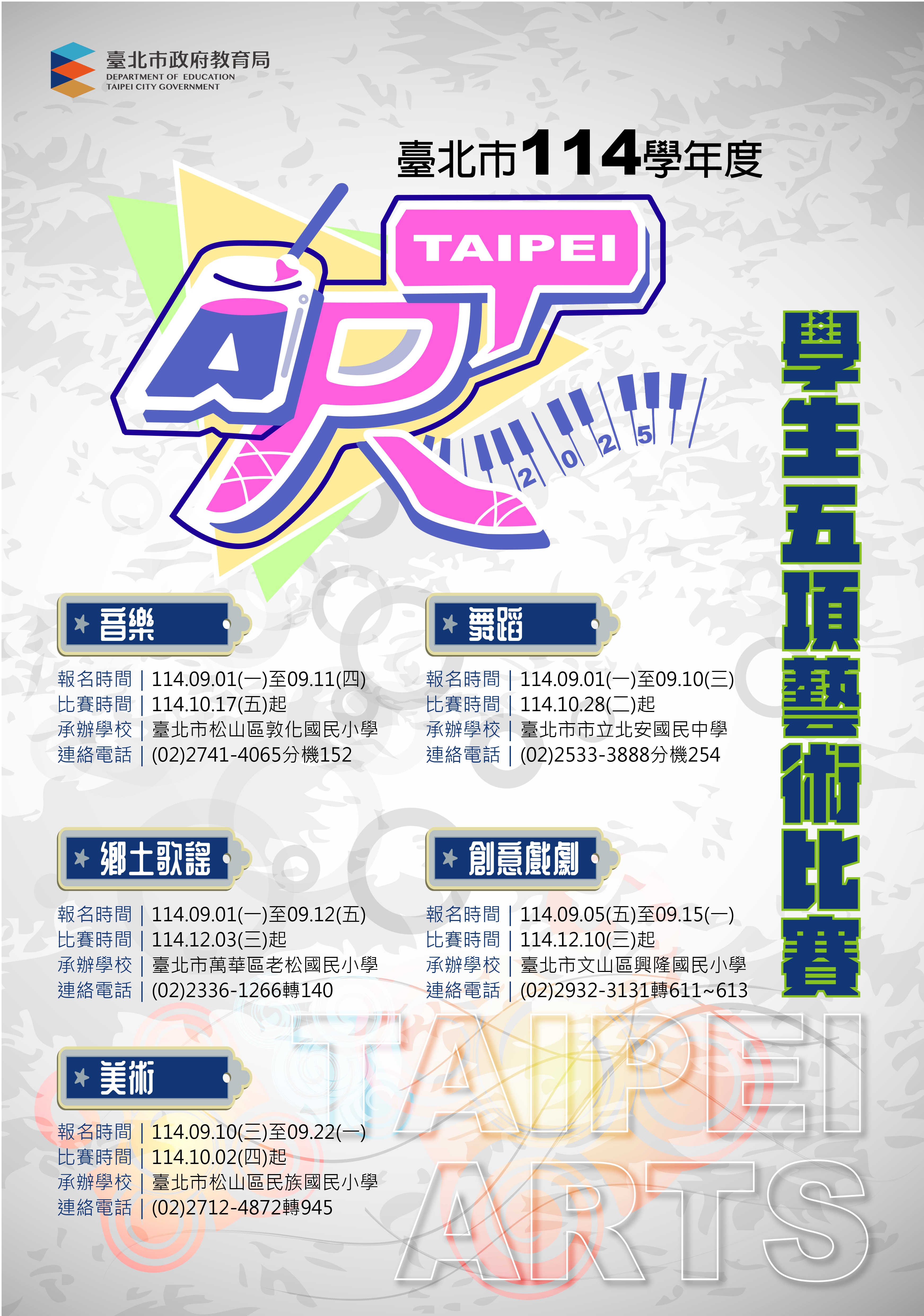 | 公告主旨 | 北市學生五項藝術比賽9/1起報名,請上五項藝術比賽網站查詢。 |