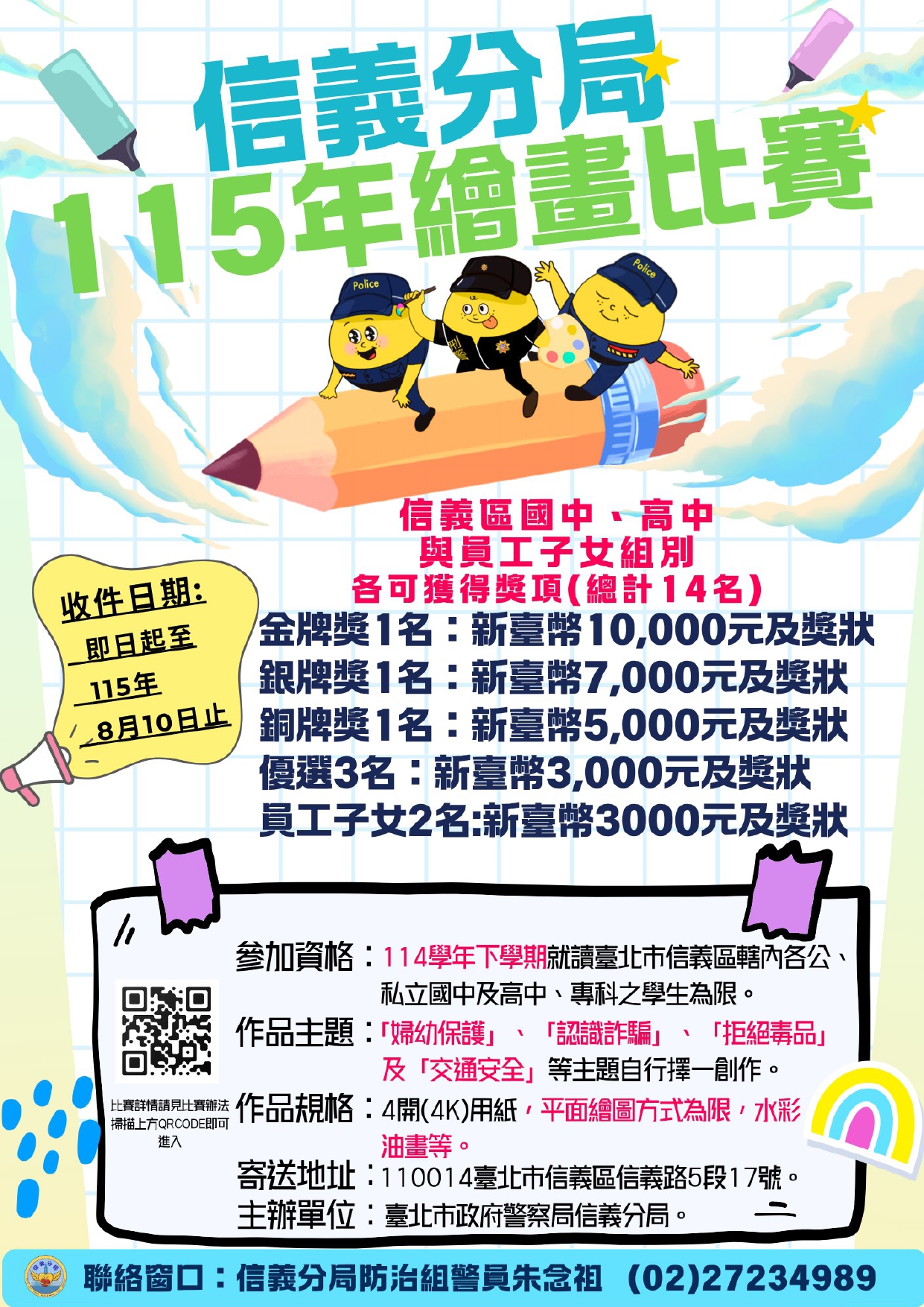 | 公告主旨 | 臺北市政府警察局信義分局舉辦「115年婦幼保護、認識詐騙、拒絕毒品及交通 安全繪畫創作比賽」,請同學踴躍報名參賽! |